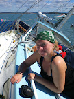 Am Sonntag bin ich dann wieder zurueck gefahren, weil mir von meinem Gastgeber eine mehrtaegige Segeltour auf der Sea Wanderer, unserer derzeitigen Behausung, versprochen wurde. Martin hat sie vor etwa 2 Monaten gekauft und bisher nur bewohnt, aber noch nie von ihrem Platz bewegt. Am Montag legten wir dann auch einigermassen puenktlich ab, um mit der Flut den Hafen verlassen zu koennen. Nach etwa 1 Stunde Fahrt mit Motorantrieb, entschieden wir die Segel hochzuziehen, was sich aber als einigermassen kompliziertes Unterfangen erwies, da uns beiden das Boot noch fremd war. Waehrend wir dann beide an dem Segel herumfuchtelten, erfuehr ich dann auch dass Martin bisher nicht viel mit Segeln zu tun hatte. Ploetzlich blieben wir mitten auf dem Kanal stehen und mussten feststellen, dass wir auf eine Sandbank aufgelaufen waren. Einige Versuche mit dem Rueckwaertsgang wieder herunterzukommen blieben erfolglos. Nach einiger Zeit kam ein altes Fischerboot vorbei und bot uns per Ferngeschrei an, uns herauszuziehen. Martin ruderte im Beiboot zu ihnen herueber und lies sich ein langes Drahtseil reichen, was aber leider gerade eben nicht lang genug war. So ruderte er verzweifelt etwa 5-10 Meter von unserem Boot entfernt und rief mir immer wieder zu, dass ich ein anderes Seil rueberwerfen sollte. Ich versuchte es, aber entweder war das Seil zu kurz oder meine Wurfskills zu bescheiden- es gelang mir nicht. Gleichzeitig kam die Ebbe, das Wasser verschwand und das Boot neigte sich immer weiter zur Seite. Ich hatte das Gefuehl wir kippen gleich um, war allein auf dem Boot, hatte mit dem Seilwerfen versagt und fuehlte mich ziemlich miserabel.. Die Fischer und Martin gaben irgendwann auf und beschlossen, dass wir auf die naechste Flut warten muessten. Das taten wir dann auch. Es wurde ueberraschenderweise ein sehr angenehmer Nachmittag. Wir sassen auf dem Deck unseres gestrandeten, ca. 75 Grad geneigten Bootes, die Sonne schien und tranken Rotwein, knabberten Kekse und lasen uns gegenseitig aus einem Seemansroman vor. Ab und zu kam ein Motorboot vorbei, dessen Besatzung wir dann unser peinliches Missgeschick berichten mussten. Unter Deck gehen war eine grosse Kletteraktion bei der man sich wie im Raumschiff fuehlte. Zum Glueck hatten wir vorher alles gut verstaut, so dass nichts kaputt gegangen ist. Gegen 16:30uhr kam das Wasser wieder, das Boot erhob sich wieder und wir konnten weiter. Es reichte gerade noch um in die naechste Bucht zu kommen und Anker zu legen, bevor es dunkel wurde. Dort haben wir dann den Sonnenuntergang bewundert und tatsaechlich noch Delfine gesehen. Am naechsten Morgen sollte dann tatsaechlich gesegelt werden. Wir setzten die Segel und fuhren los. Leider hatten wir so gut wie keinen Wind und dafuer ziemlich hohe Wellen, so dass wir ziemlich durchgeschaukelt wurden. Nach einiger Zeit war uns beiden schlecht und wir beschlossen zurueck zu fahren, an Land zu rudern uns spazieren zu gehen. Abends fragten wir uns beide, ob wir wirklich noch von der Idee begeistert sind per Segelboot die Welt zu bereisen (Martin hat sich fuer diesen Zweck das Boot gekauft und moechte naechstes Jahr im Mai/Juni losfahren). Aufgeben will er den Plan aber noch nicht und bis dahin machen wir noch ein paar Trips, um die Segelliebe zu testen.
